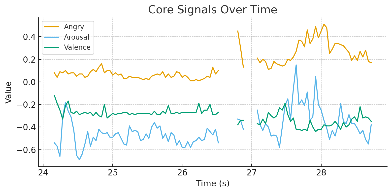 When such signals co-occur, the system captures not just a single emotion but a synergistic emotional cluster: growing anger, amplified by anxiety, reinforced by disgust, and locked in a state of worry. This cluster suggests that the subject is not only irritated but also losing emotional regulation—a pattern that often precedes aggressive behavior.