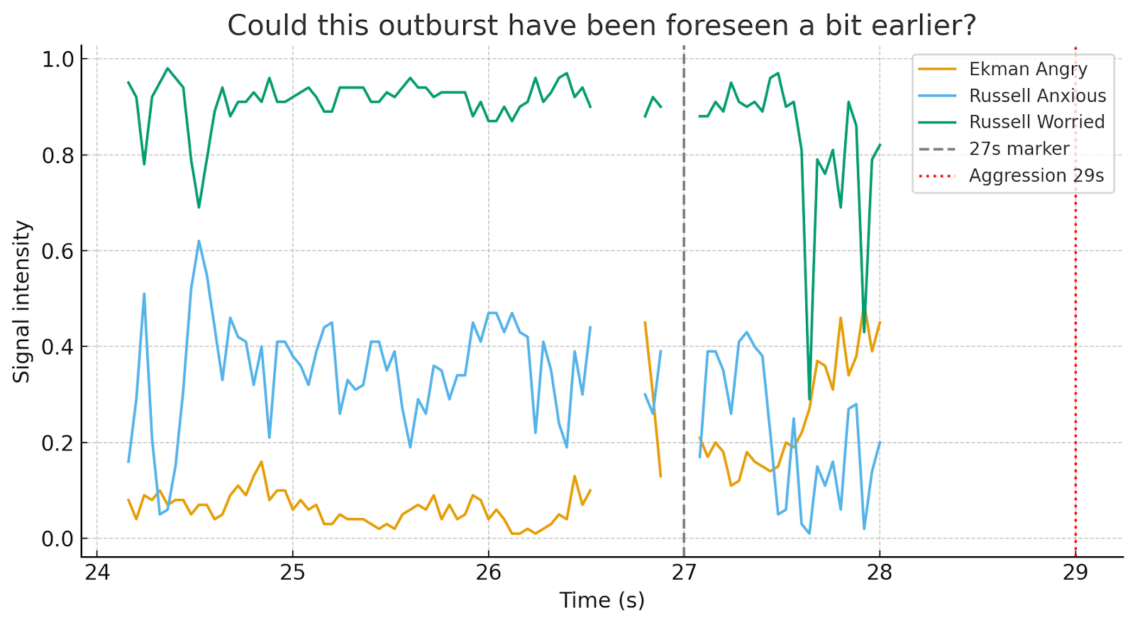 The graph from 20–28 s illustrates this trajectory clearly: anger climbing, anxiety sustained, and worry dominating the affective space, with the 27 s mark already showing heightened risk well before the 29 s aggression.