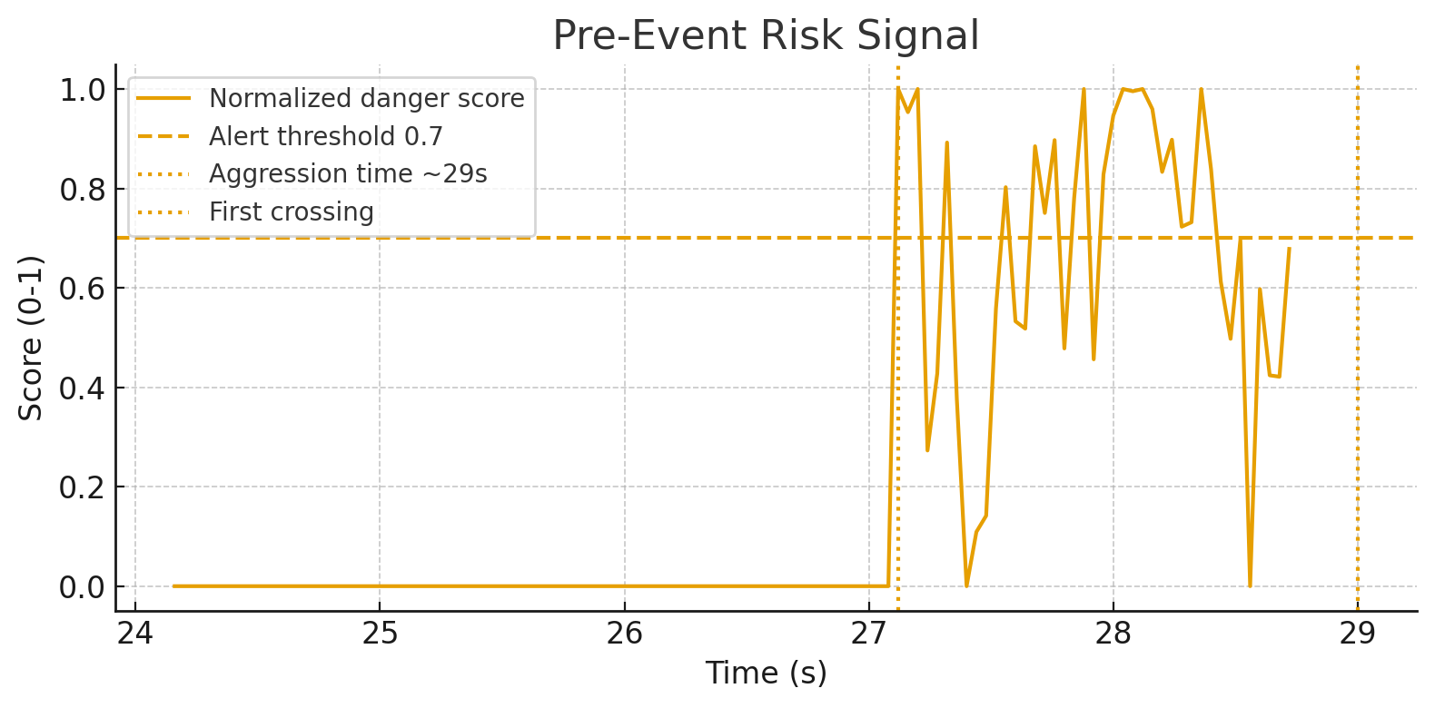 - → raise alert when the combined score ≥ 0.7 for ≥ 0.3 s (hysteresis to avoid flicker).
